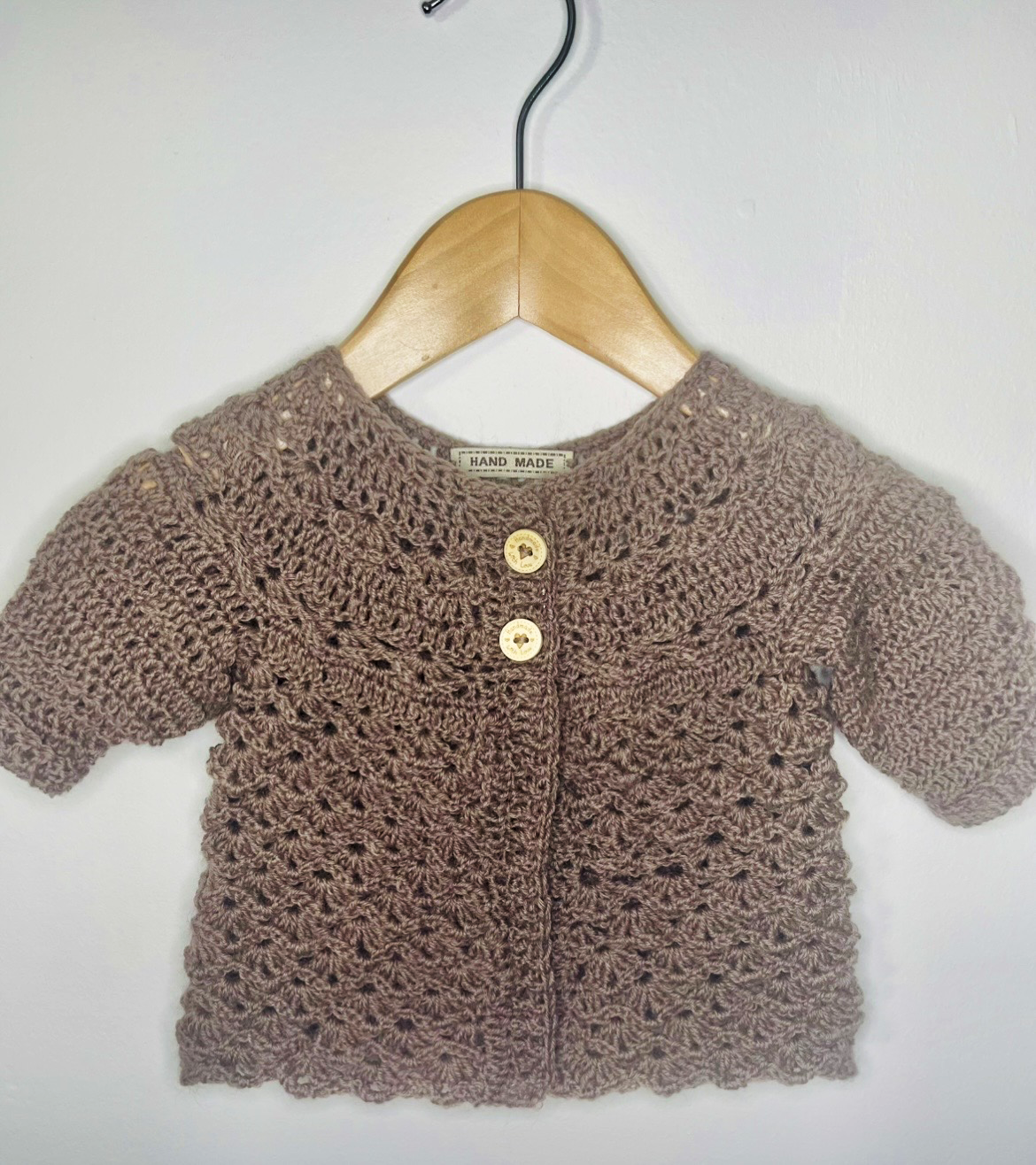 Hand-crocheted baby cardigan and matching booties, made with a soft, wool-rich yarn in a warm autumn brown shade.