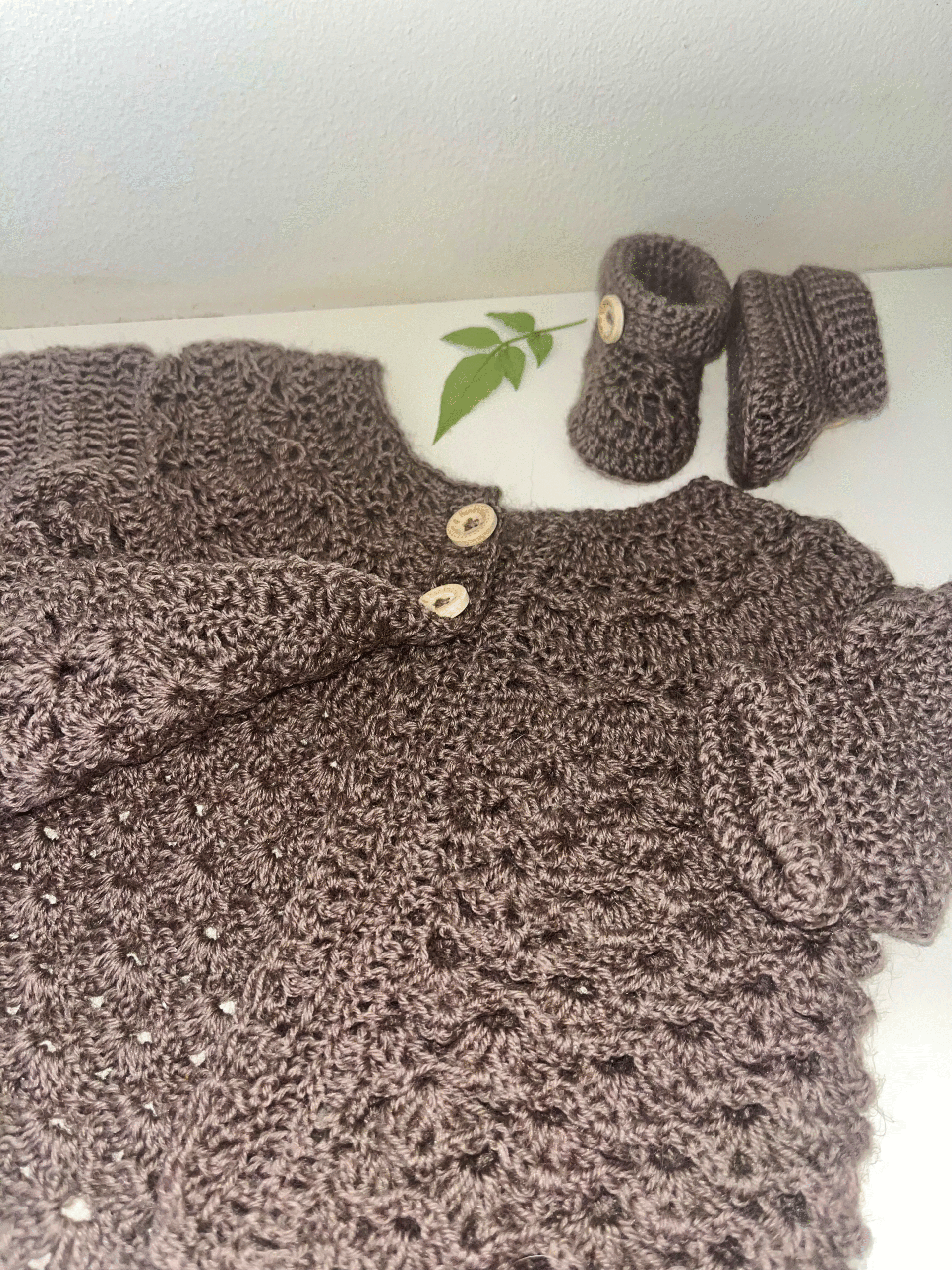 A soft, hand-crocheted baby cardigan and matching booties made from wool-rich yarn in autumn brown.